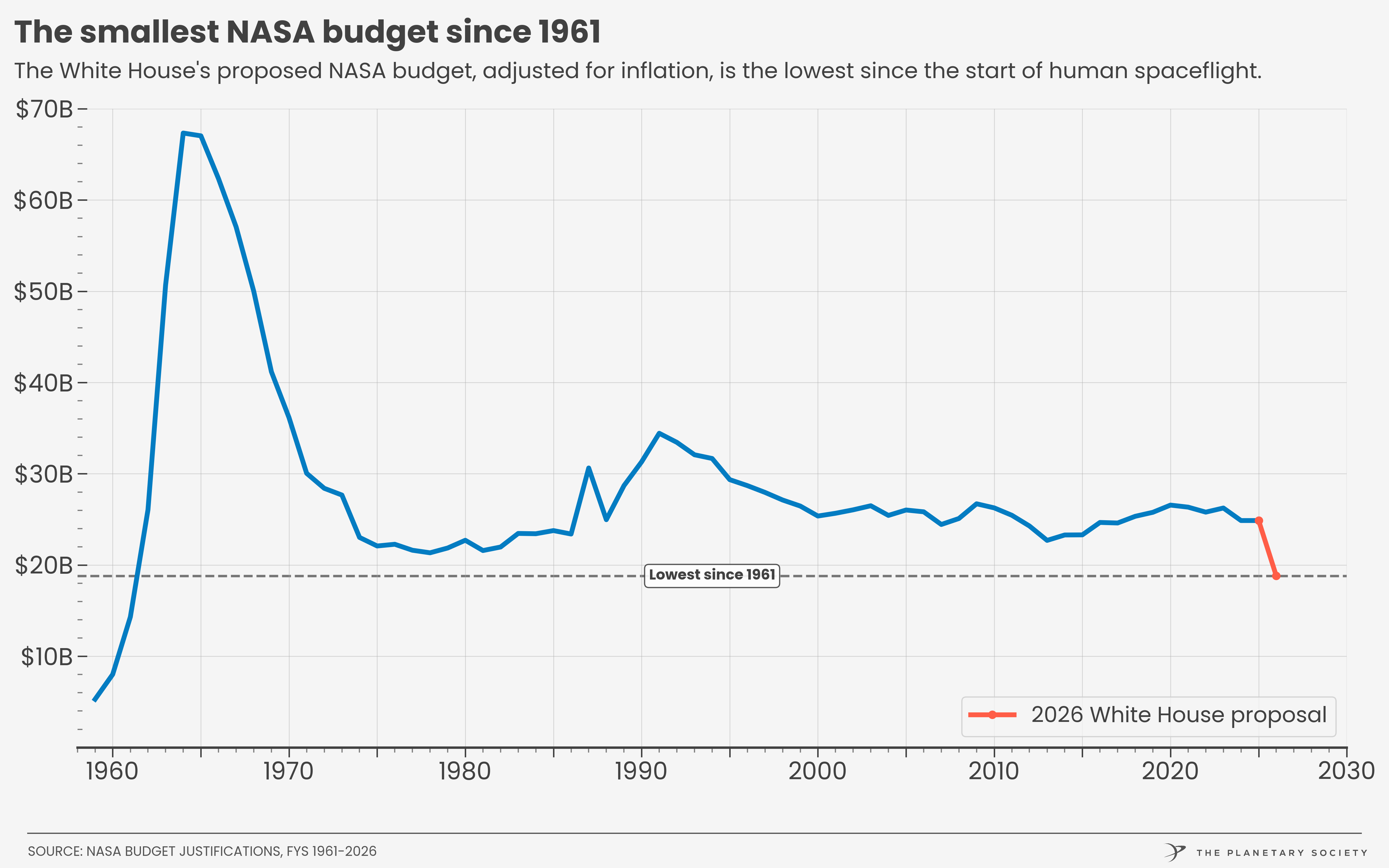 This bill would reduce NASA’s science budget by 47%, the largest cut in the agency’s history, bringing its total funding down to an inflation-adjusted level not seen since 1961. For context, NASA’s budget is already relatively modest. Under this proposal, it would be reduced from $24 billion to $18 billion, while the Department of Defense sees a staggering $120 billion increase, pushing its budget to over $1 trillion. I’ve previously written about how little we spend on NASA and the tremendous return on investment it provides here. The chart below from The Planetary Society shows just how historically steep this proposed cut would be: